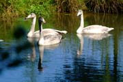 Die drei jungen Sing-Schwäne im Spiegel des Wassers. Noch sind ihre Schnäbel nicht gelb und ihre Federn noch grau (Bild: Musevita) |